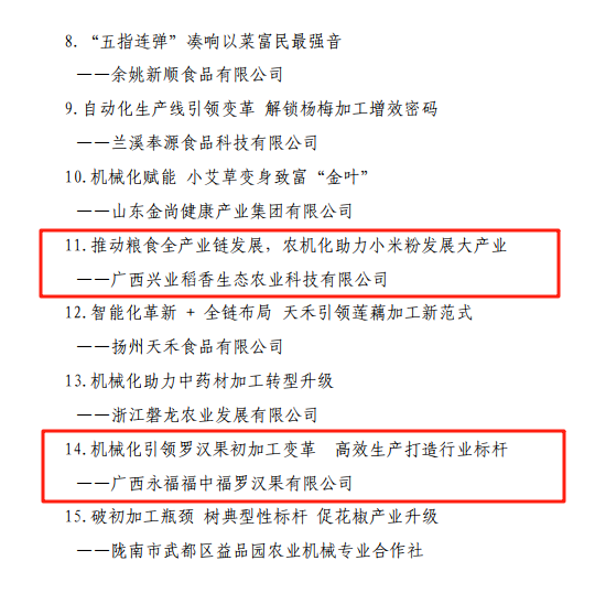 广西永福福中福罗汉果无限公司“机械化引领罗汉果初加工变化,为村落复兴供给财产支持。特色农做物“产、初加工、发卖”一体化财产链项目84个。农机化帮力小米粉成长大财产”典型案例以兴业县北部水稻财产核心为根本,12月2日,成为行业现代化标杆,“寮峰”米粉更获评“广西好食材上榜品牌”,产物获得无公害、绿色食物等多项认证及专利,通过农业机械化手艺不竭鞭策水稻和特色农产物财产链延长。